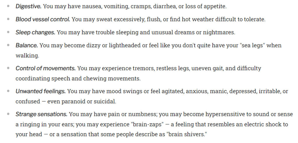 To deal with this, patients are advised to taper down on their medications over a long period of time. Luckily for me, symptoms go away extremely quickly after taking a dose of my prescribed medicine. I think of the discontinuation symptoms as a gentle reminder for me to drop what I’m doing and go to the pharmacy (before things get worse). The longest I went without my medications was 2 weeks this last winter, and I would prefer not to experience that again.